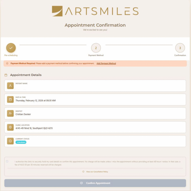 This process is facilitated through Stripe and authorises ArtSmiles to charge a cancellation fee only if the patient does not attend the scheduled consultation or cancels outside the terms set out in our Cancellation Policy.
